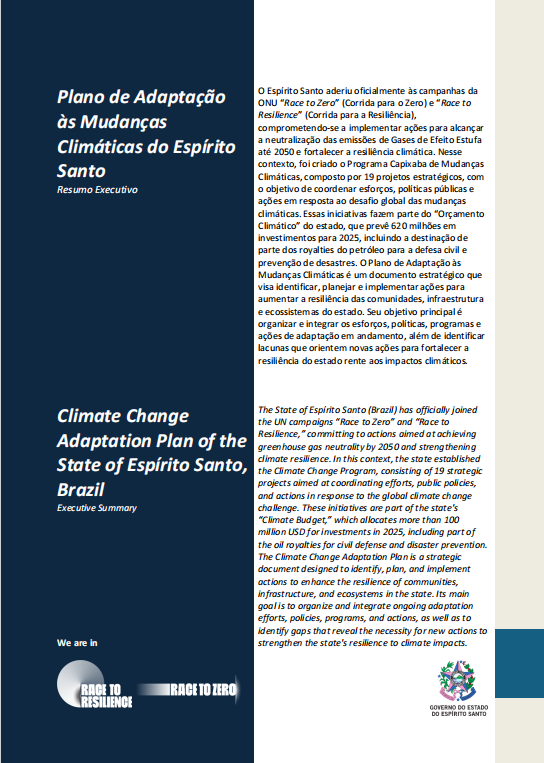 Este Plano tem como objetivo principal identificar vulnerabilidades, propor medidas e orientar ações que aumentem a resiliência do território capixaba diante dos impactos das mudanças climáticas — como eventos extremos, escassez hídrica, elevação do nível do mar e riscos à saúde e à economia.